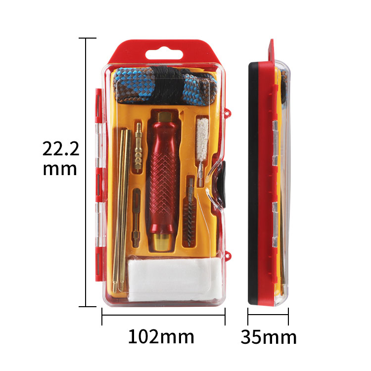 Setul compact de curățare a armelor vă oferă instrumentele de curățare profesionale complete pentru a face față diferitelor calibre de arme. Tăvile cu blistere vă ajută să le colectați în mod regulat. Volumul mic și carcasa puternică vă pot permite să le puneți în cutii pentru arme sau în saci. Seria este fără sticlă de ulei.